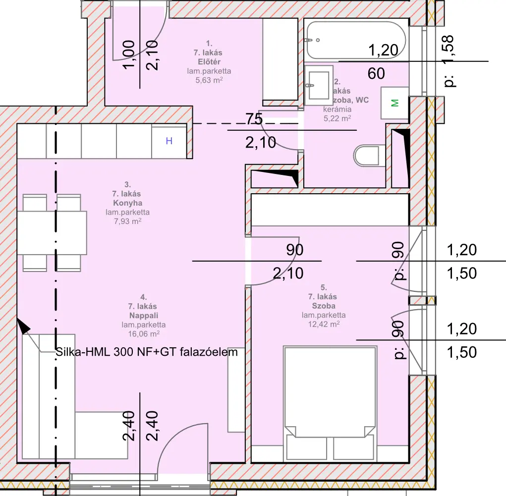 | 1. szint | Fürdőszoba, WC | 5,22 ㎡ |